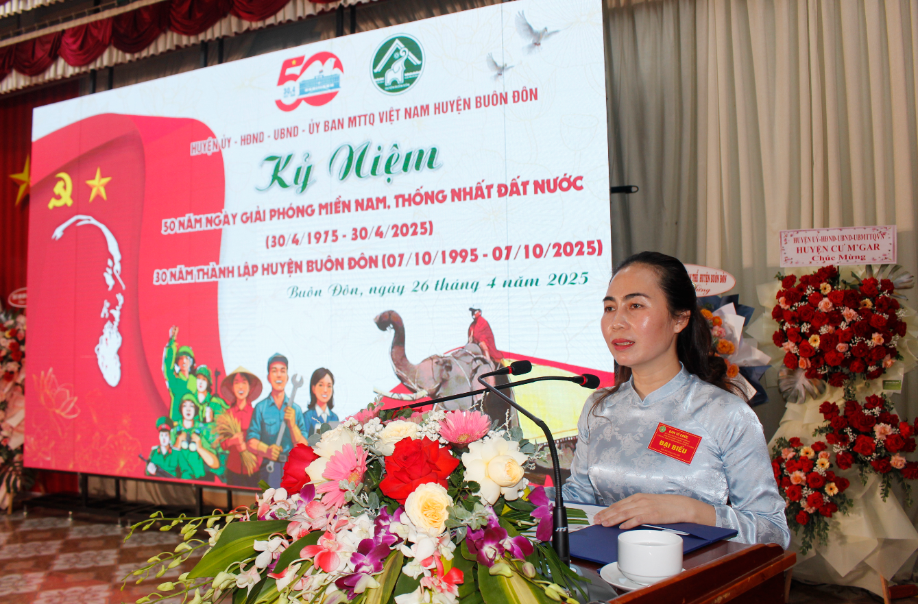 Phát biểu tại buổi lễ, đồng chí Lại Thị Loan – Bí thư Huyện ủy khẳng định: “Hòa chung trong dòng chảy lịch sử của đất nước, của dân tộc, của tỉnh nhà, Đảng bộ và Nhân dân các dân tộc huyện Buôn Đôn đã luôn thống nhất ý chí và hành động, chung sức, đồng lòng, thực hiện các nhiệm vụ để xây dựng huyện từng bước phát triển về kinh tế, xã hội, giữ vững quốc phòng, an ninh chính trị, trật tự an toàn xã hội, xây dựng Đảng, xây dựng hệ thống chính trị đáp ứng yêu cầu đặt ra”.