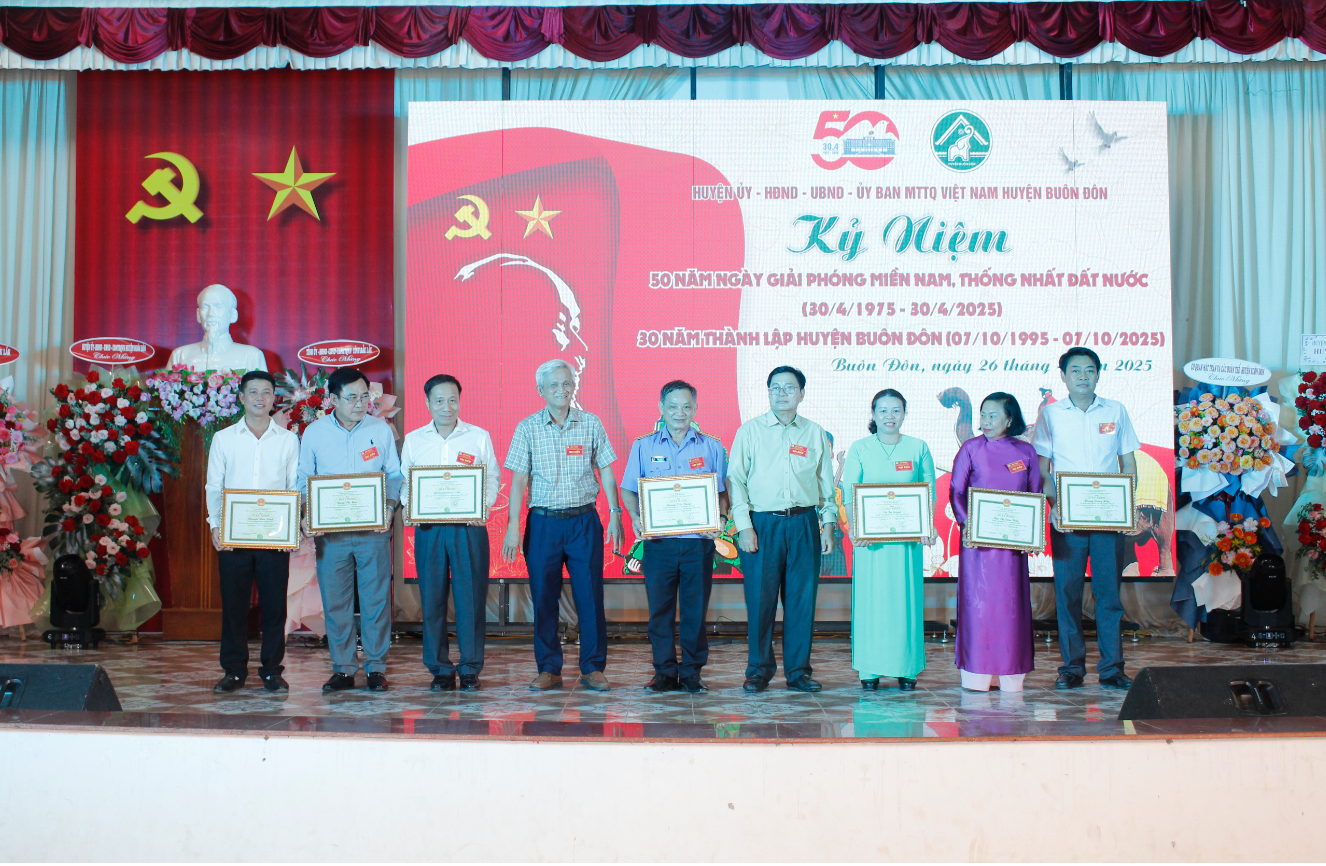Nhân dịp này, UBND huyện Buôn Đôn đã khen thưởng cho 30 tập thể và 60 cá nhân có nhiều thành tích xuất sắc trong xây dựng, phát triển huyện Buôn Đôn.